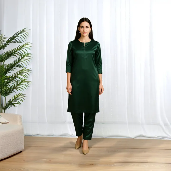 Enhance your wardrobe with this plain satin silk flag green unstitched fabric designed for creating stylish and comfortable outfits. The fabric features a smooth texture with a soft shine, giving your stitched dresses a premium look.